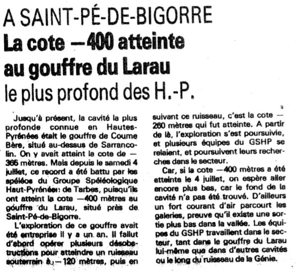 | Historique des explorations Références bibliographiques | Autre document | La NR | 07/05/2020 | Titre 1014-Article sur le Larau -400