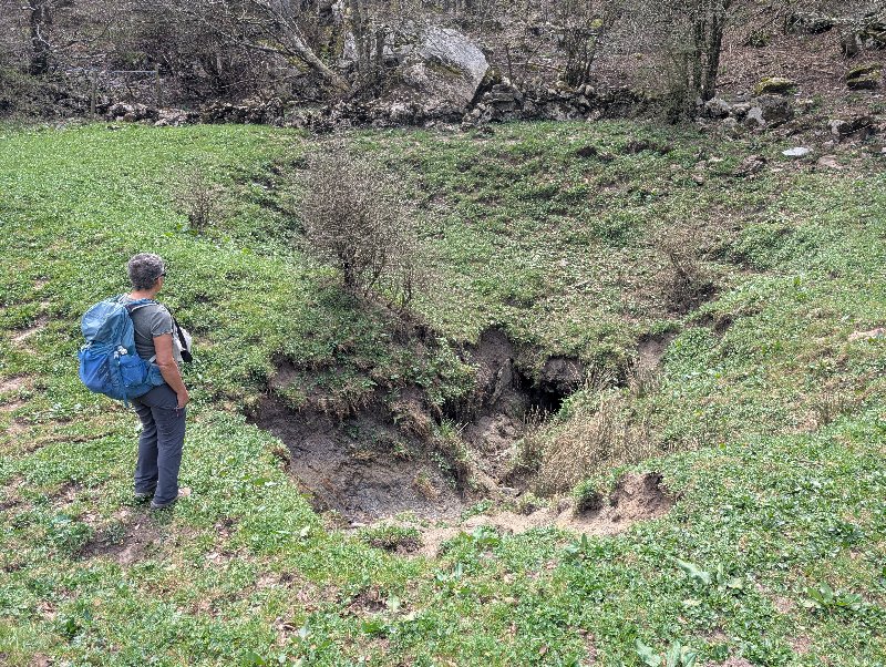 Résumé Il s'agit de la perte principale du poljé. Les récentes crues (2024-2025) ont bien creusé l'entonnoir terreux laissant apparaître de la roche. Mais celle-ci, à ce niveau, est constituée d'éboulis. Pas de courant d'air.