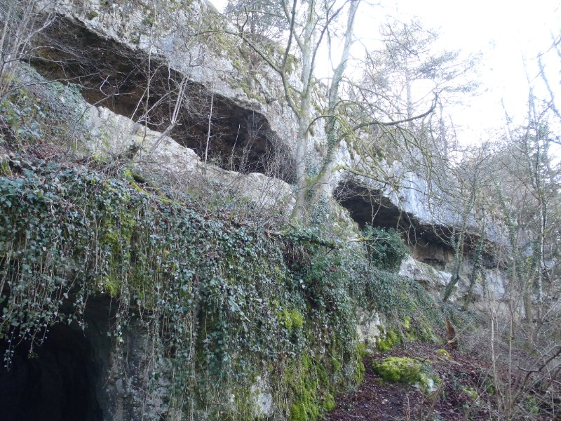 | Abri sous-roche, ... | Photographie | B. Humbel | 14/01/2025 |  | Vue générale du "Nid d'Aigle" (= grotte E) | | Aujourd'hui deux abri-sous-roche perchés, communiquant à l'intérieur. La cavité devait être à l'origine un fantôme de roche, formé sur un des niveaux de calcaire légèrement dolomitisés du Bathonien moyen-sup ("Comblanchien"). L'élimination totale du fantôme a pu être faite à l'époque où la rivière Meuzin coulait à cette altitude, mais peut tout aussi bien être d'origine anthropique. Ce porche est resté visible de loin, jusqu'à ce que les plantations de résineux sur le versant ne finissent par le dissimuler (sauf en hiver). |