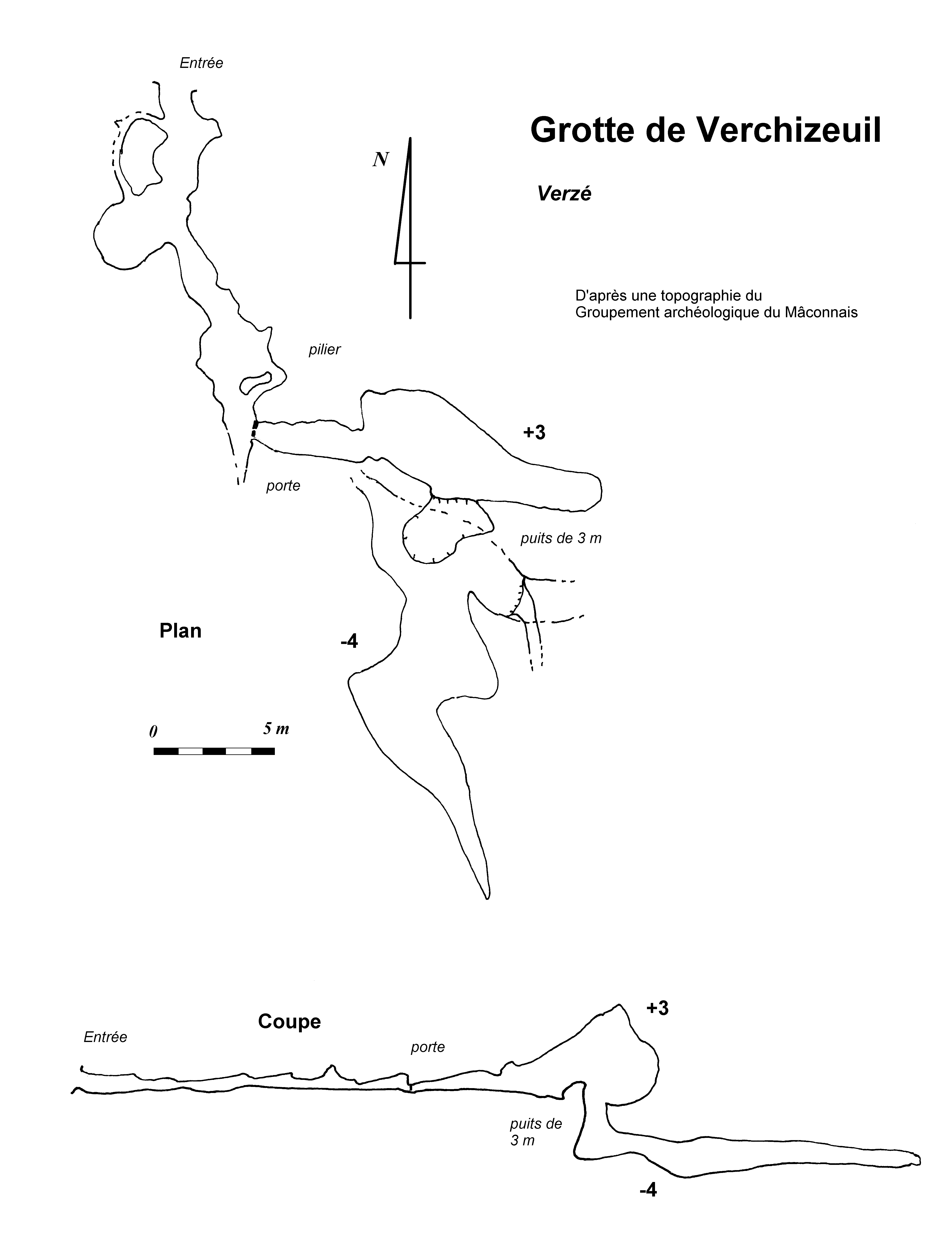 | Historique des explorations Références bibliographiques | Document texte | Guillot-Morel-Simonnot | | Interventions humaines : fouilles archéologiques. Historique : Barthélémy A., Groupement Archéologique Mâconnais. Topo : GAM Bibliographie :- Groupement archéologique du Mâconnais (1971): Plan et coupe de la grotte de Verchizeuil - Fédération Spéléologique de Bourgogne Sud n°3, - BONNEFOY, Maurice (1972): Spécial Azé - Bulletin de la FSBS, n°4, 53 pages - BONNEFOY, Maurice (1975): Grottes d'Azé, 1000 siècles de vie - Presses du Prado de Salornay-Hurigny, 48 pages - GUILLAUMIN, Serge (1986): Complément à l'inventaire karstique de Saône-et-Loire - Sous le Plancher n°1, 1986, p.68 à 72 - ARGANT, Alain (1990): Un gisement paléontologique du Pléistocène moyen en Mâconnais : la grotte de Verchizeuil à Verzé - Groupe archéologique mâconnais, Mâcon, p.9 à 27 | |