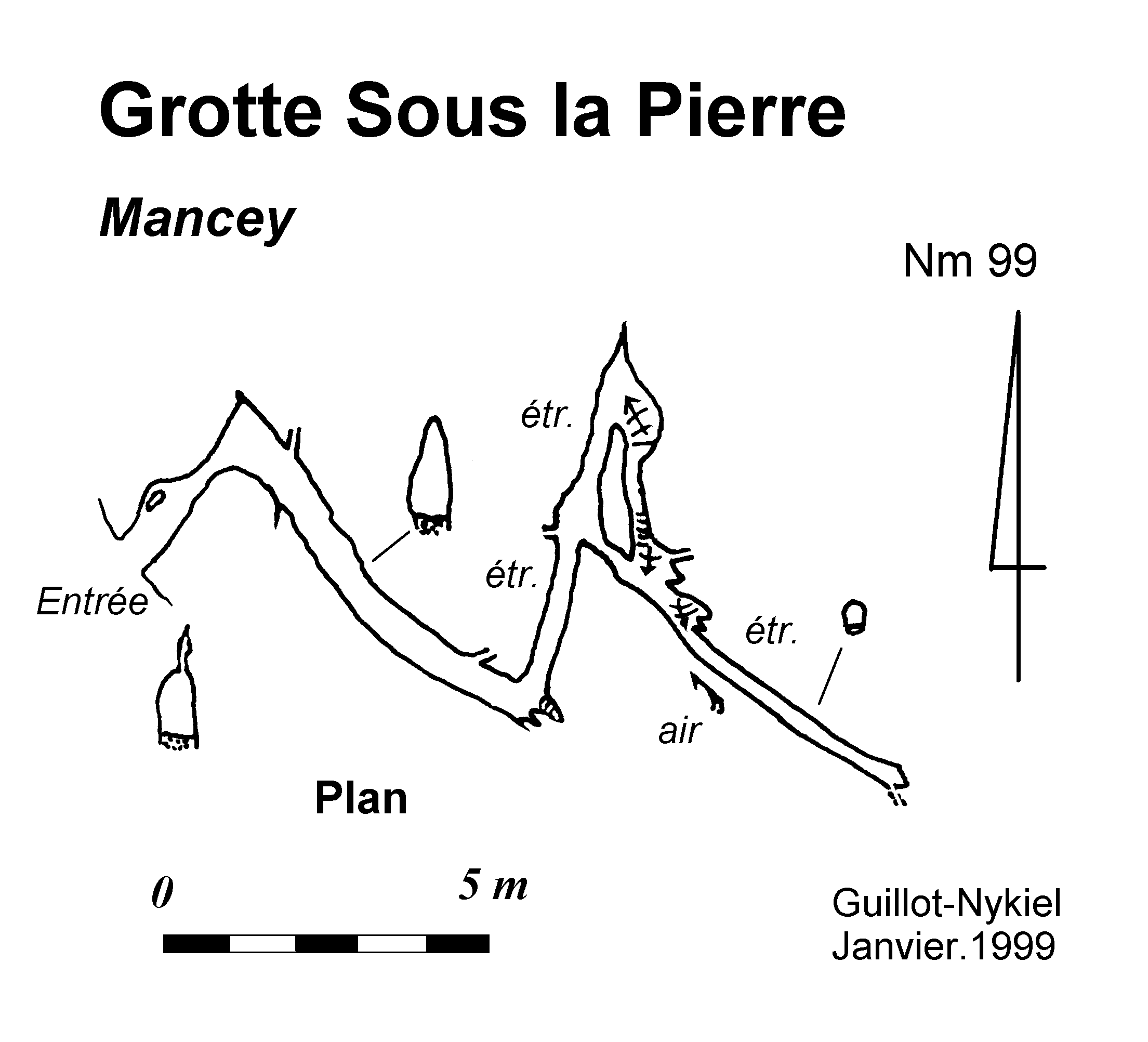 Description : Dimension de l'entrée : 0,7 x 0,4 m. Boyau de 23 m axé sur des diaclases ; trois coudes le font changer de direction. L'argile colmate partiellement le boyau terminal. On remarque à ce niveau un léger courant d'air soufflant. Géologie : j7-8 Kimméridgien. Historique : Désobstruction des spéléos du SC Tournugeois en 1967. Une inscription entre les étroitures 3 et 4 témoigne de leur travail : "Dégageons boyau le 30-10-67 Bertrand-Laurent". Les années et ...les blaireaux sont ensuite passés par là, rebouchant consciencieusement les étroitures. Après une rapide reconnaissance en décembre 98 (LG-GS), les étroitures sont réouvertes en janvier 99 et la topographie éffectuée (LG-ChN) Topo : Guillot-Nykiel 99 Bibliographie :- Anonyme (1966): Explorations locales en cours - L'Echo des Cavernes tournugeoises, décembre 1966, p.28-29 - BELLICOT,G. (1966): Inventaire des cavernes du Tournugeois au 1er novembre 1966 - L'Echo des Cavernes tournugeoises, décembre 1966, - Anonyme (1967): Principales activités en 1967 - L'Echo des Cavernes tournugeoises, décembre 1967, p.9-10 |
