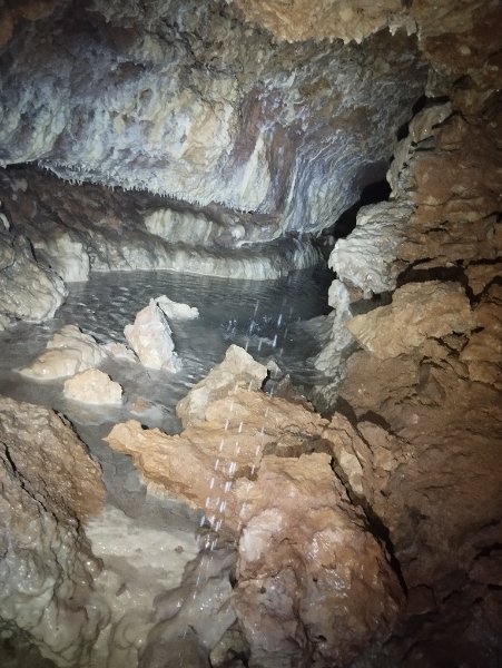 Résumé Après une entrée où il faut marcher à quatre pattes, la cavité s’élargit au bout d'une vingtaine de mètres, pour donner sur un petit lac très concrétionné, avec un ruissellement abondant depuis le plafond.