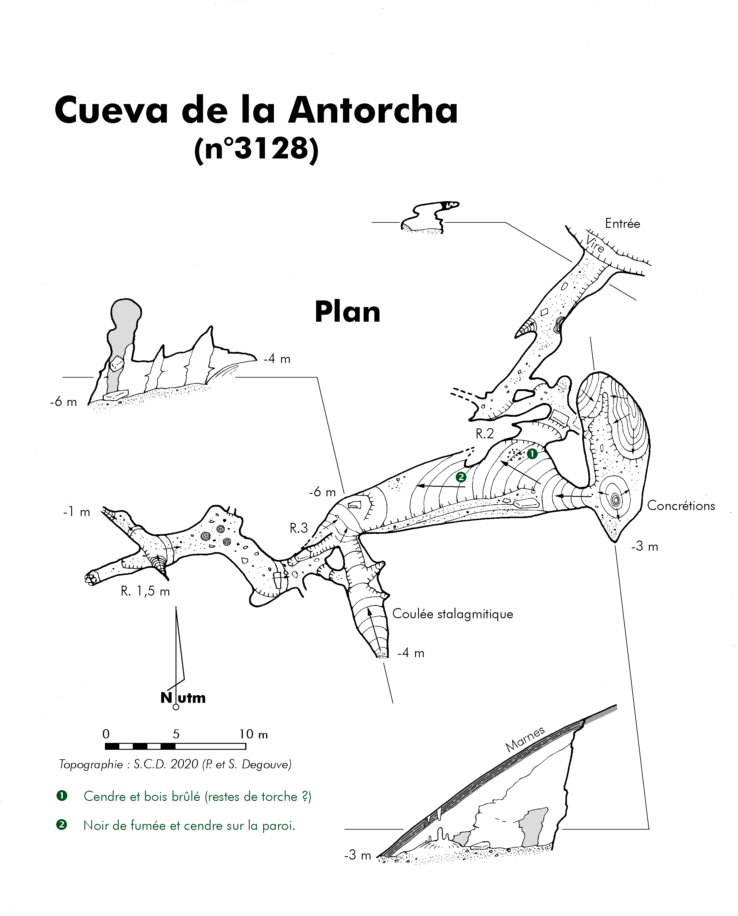 3128 (SCD) : Cueva del Antorcha. Description : La galerie, de taille modeste sur les 15 premiers mètres, rejoint un conduit plus important en deux endroits. Une première salle s'est creusée à la faveur d'un joint marneux qui révèle clairement la structure de la lentille dans laquelle se développe la cavité. Juste après, le conduit devenu plus vaste (2,5 x 4 m) se divise au bout de 20 m. A gauche, il vient buter sur une coulée stalagmitique (-4 m). A droite, après une courte escalade de 3 m la galerie se prolonge encore sur une dizaine de mètres jusqu'à un nouveau dédoublement. Dans les deux cas, le conduit devient rapidement impénétrable (trémie). Pas de courant d'air. Des traces de passages, peu nombreuses, ainsi que des cendres provenant probablement d'une torche artisanale ont été observées en plusieurs endroits, mais il est difficile d'en estimer l'ancienneté. Développement : 80 m ; dénivellation : 8 m Niveau géologique : 13 La cavité se développe dans la lentille de la Becerral échancrée par la source du rio Gándara. Historique des explorations : La cavité avait été visitée sans doute par des autochtones et cela malgré les difficultés d'accès. Elle est retrouvée et topographiée par le S.C. Dijon, le 19 août 2020 (P. et S. Degouve). Topographie : S.C. Dijon 2020 Résurgence présumée : ? |