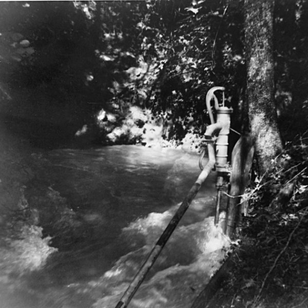 Seconde crue "centenale" du 20° siècle, après celle de 1910. Le cliché rappelle que l'entrée s'est en grande partie créée naturellement au 18° siècle, sous la pression d'une crue similaire. Lors de la prise de vue, une pompe à bras existait encore (elle puisait l'eau dans la partie amont du réseau, aujourd'hui fermée par une grille pour captaga en A.E.P. par forage).