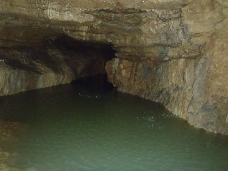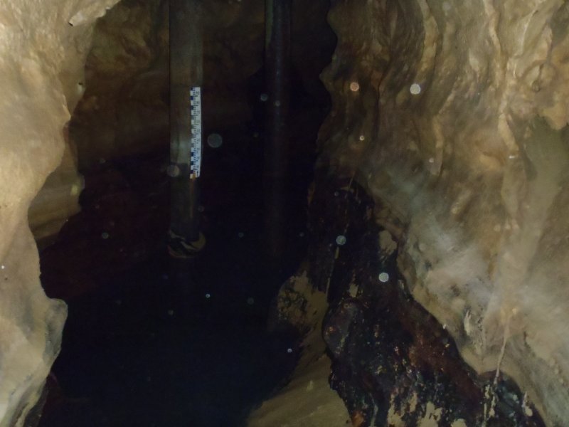 La totalité du fond de combe est couverte d'eau - l'essentiel provenant de l'entrée de l'Abîme -. Le bidon flottant sur l'eau a été éjecté depuis l'amont du réseau, où il servait au flottage du radeau construit pour les opérations de plongées par R. Rorato, à la suite du forage A.E.P. de