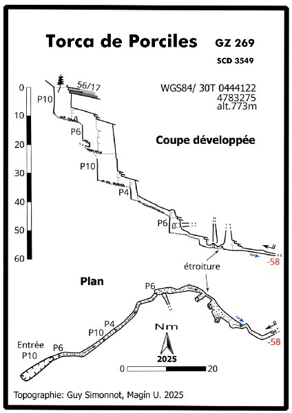 Situation: Pour accéder au trou il faut prendre la route qui depuis La Concha se dirige vers le cirque de Brenaescobal ; une fois dépassé la Ermita del Toral prendre le petit chemin de gauche en direction des prairies de Porciles. Description: Ouvert seulement à une dizaine de mètres de la torca de Porciles 2 (GZ268), cette cavité s'est creusée au départ à la faveur d'une diaclase direction Nord-Est. L'entrée (8.5 x 3.5) nous situe en haut d'un P10 au sol rempli de déchets. À partir de ce point, une diaclase ne dépassant jamais le mètre de largeur conduit à travers d'une succession de petits puits (P6, P10, P4), en haut d'un P6 où on trouve un premier petit élargissement. Bientôt les dimensions vont se réduire à nouveau et ce ne sera que grâce à une desob dans une étroiture très humide et soufflante par temps chaud, qu'on accède à un deuxième et dernier élargissement en forme de salle. Dans cette salle, on trouve plusieurs arrivées au plafond et on voit apparaître aussi un petit ruisseau qui nous accompagnera dans le reste du parcours. À l'extrémité de cette petite salle, le toit va s'abaisser pour ne plus dépasser les 40 cm de hauteur, dans un laminoir où il sera particulièrement ardu d'éviter l'eau. Le trou se terminera dans un diverticule étroit et soufflant où on peut observer l'eau disparaître dans un conduit ayant à peine une vingtaine de centimètres de diamètre sur au moins deux mètres de longueur. Une désob à ce point serait bien difficile et complexe à mettre en œuvre. Géologie : La cavité se développe dans les niveaux de grès et calcarénites du Toral qui représentent la partie inférieure de la formation "Areniscas del Miera". Celle-ci, comprise ici entre les calcaires de la Concha et les calcaires du Haut-Rolacia (8) est stratigraphiquement un équivalent latéral de la partie supérieure des formations de Peña Lavalle - Bucebrón (4) au nord et des grès d'Asón à l'est (niveau 5). Hydrologie : La galerie parcourue par un petit actif s'enfonce globalement dans le sens du pendage (15 à 20° pour une orientation Est/Nord-Est). La position stratigraphique et l'altitude déjà basse incitent à envisager l'appartenance au bassin d'alimentation de la Cubera dans le Val d'Asón, à 8,7 km et environ 600 m plus bas.. Historique: Torca trouvée le 04 juin 2023. Première descente le 29 juillet 2023. Désobstructions au fond le 30 septembre 2024.