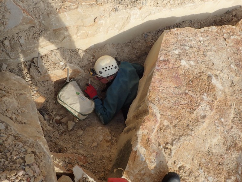 Résumé L'entrée actuelle se situe quelques mètres sous la limite supérieure des calcaires de Comblanchien (près des personnages). La galerie débouchait autrefois en partie basse, à la limite gauche du tas de blocs.
