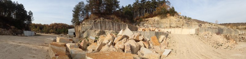 | | | Carrière, ... | Photographie | B. Humbel | 31/12/2017 |  | Vue d'ensemble carrière des Buis (en 2017) | | L'entrée actuelle se situe quelques mètres sous la limite supérieure des calcaires de Comblanchien (près des personnages). La galerie débouchait autrefois en partie basse, à la limite gauche du tas de blocs. |