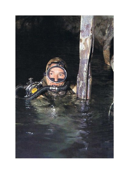 Robert RORATO accroché au tuyau de la pompe dans le lac amont de l'Abîme de Bévy.